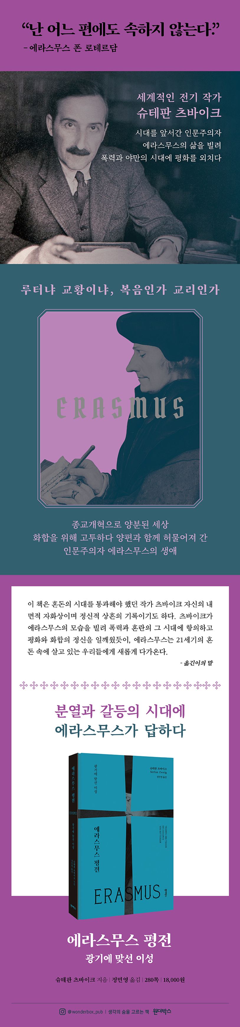 이 책은 『발자크 평전』, 『위로하는 정신』(몽테뉴), 『다른 의견을 가질 권리』(카스텔리오) 등 여러 평전을 남긴 슈테판 츠바이크의 대표작으로, 에라스무스를 다룬 여러 책 가운데 가장 유명한 책이다. 츠바이크가 나치를 피해 망명하기 직전에 출간한 이 책은, 종교전쟁의 혼돈 속에서 모든 극단을 거부하며 평화와 자유를 지키려 했던 인문주의자 에라스무스의 삶을 빌려 광란의 시대를 고발하고 자신의 신념을 밝힌 작품이다. 츠바이크는 이성과 계몽의 힘으로 인류의 화합을 이루려는 에라스무스의 숭고한 정신과, 어느 편에도 들지 않고 어떤 위험도 피하려는 태도로 행동에 나서지 못하는 그의 소심함을 동시에 보여 준다. 츠바이크가 생생하고 역동적인 필체로 그려 낸 에라스무스의 모습은 대립과 반목, 갈등과 혐오의 시대에 어떻게 살아가야 할지 고민하게 할 것이다.