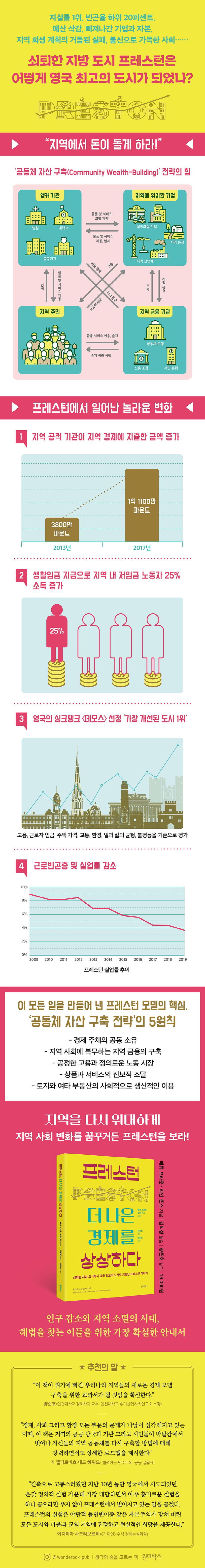프레스턴에서 일어난 변화는 ‘프레스턴 모델’이라 불리며 영국 전역에 알려졌고, 이는 현재 영국을 넘어 세계 곳곳에서 주목하는 지역 회생 전략이 되었다. 『프레스턴, 더 나은 경제를 상상하다』는 프레스턴의 놀라운 변화 과정을 생생히 전달하고, 지역 사회 변화를 가능케 한 공동체 자산 구축 전략과 협동조합, 내부 조달 등 프레스턴 모델의 핵심 전략을 소개한다. 여기에 ‘지역 순환 경제’ 연구를 오래도록 이어 온 인천대학교 경제학과 양준호 교수의 프레스턴 모델에 대한 해제 글을 더했고, 정치에 직접 뛰어들고자 하는 이들을 위해 송정복 희망제작소 자치분권팀장의 ‘한눈에 살펴보는 지방자치와 주민 참여’를 부록으로 수록했다. 이 모든 내용은 지역 사회의 변화를 도모하는 이들에게 가장 확실한 해결책을 제시해 줄 것이다.