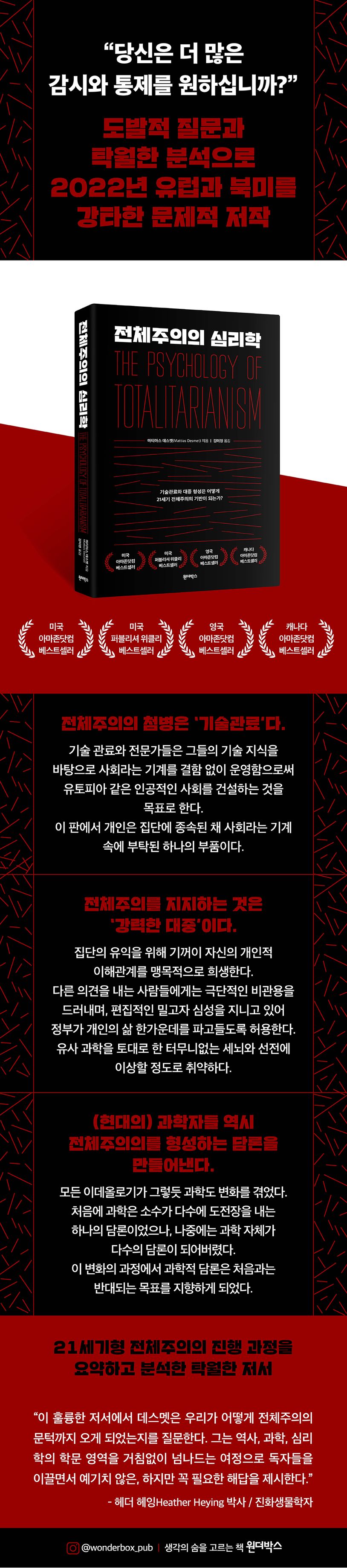 한나아렌트는이‘심리’의본질과과정까지원고를밀고나가지않았지만이책의저자마티아스데스멧은이런심리적과정에좀더천착했다.이런심리적과정을고려해야만전체주의체제의국민이지닌놀라운특성을이해할수있다.그들은집단의유익을위해기꺼이자신의개인적이해관계를맹목적으로희생한다.다른의견을내는사람들에게는극단적인비관용을드러내며,편집적인밀고자심성을지니고있어정부가개인의삶한가운데를파고들도록허용한다.유사과학을토대로한터무니없는세뇌와선전에이상할정도로취약하고,모든윤리적경계를넘어서는편협한논리를맹목적으로따른다(이로인해전체주의는종교와양립할수없다).모든다양성과창의성을상실하며(이런점에서전체주의는예술과문화의적이다),본질적으로자기파괴적이다(따라서모든전체주의체제는자멸하는결과를맞이한다).