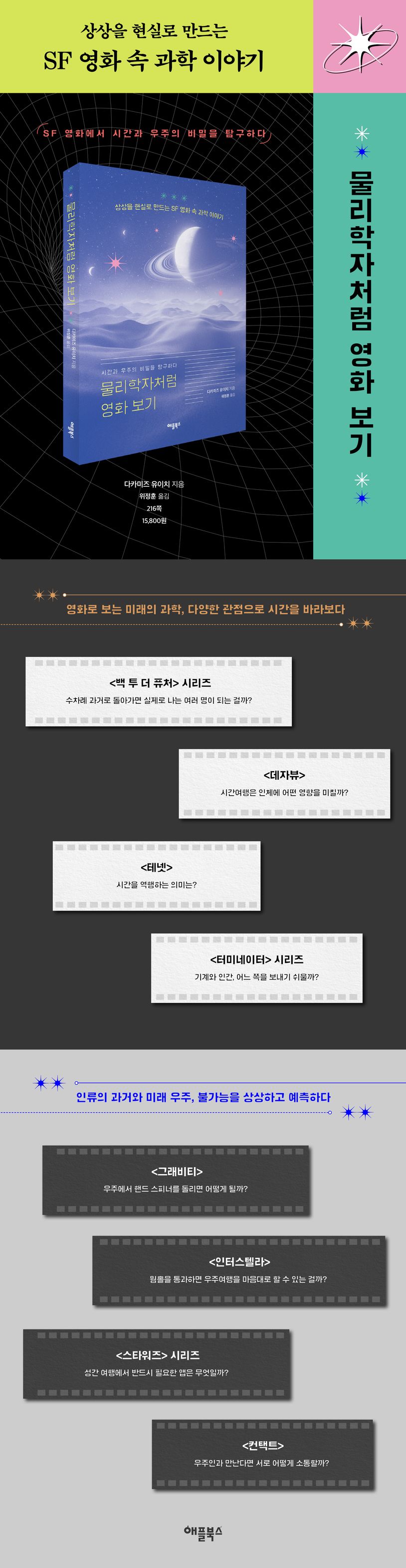 《물리학자처럼 영화 보기 物理?者、SF映?にハマる》에서는 스티븐 호킹의 제자이자 우주 물리학자인 저자가 〈백 투 더 퓨처 Back To The Future〉, 〈인터스텔라 Interstellar〉, 〈마션 Martian〉, 〈그래비티 Gravity〉 등 시간과 우주를 주제로 한 12편의 SF 영화 속에 숨어 있는 흥미진진한 미래 과학 이야기를 들려준다.