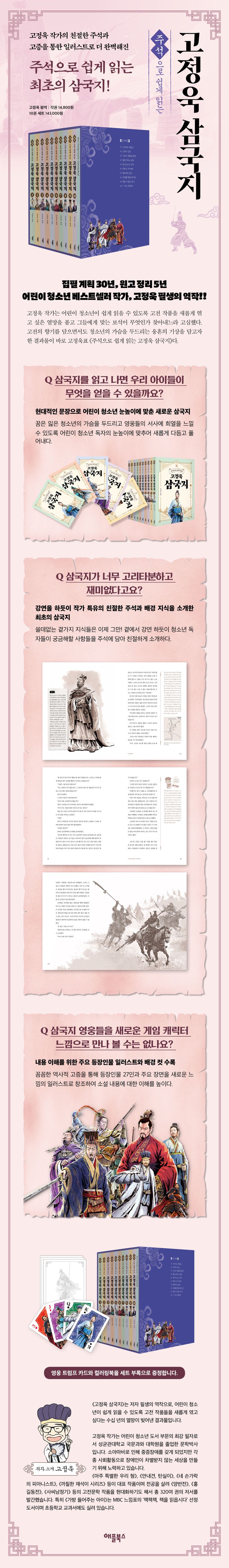 세상을 살아가는 지혜와 상대의 마음을 읽고 사람을 대하는 법을 알고자 할 때 우리는 《삼국지》를 통해 배움을 얻었다. 고전 작품을 얘기할 때 이보다 더 다이내믹하고 감동적인 작품을 찾을 수 있을까. 고정욱 작가는 어린이 청소년이 쉽게 읽을 수 있도록 고전 작품을 새롭게 엮고 싶은 열망을 품고 그들에게 맞는 보석이 무엇인가 찾아내느라 고심했다. 그리고 고전의 향기를 담으면서도 청소년의 가슴을 두드리는 웅혼의 기상을 담고자 한 결과물이 바로 고정욱표 《주석으로 쉽게 읽는 고정욱 삼국지》다.