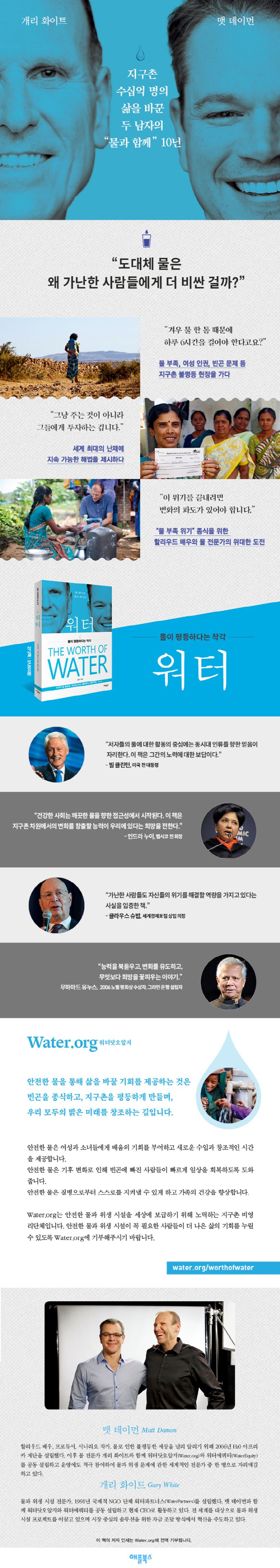 애플북스 신간 《워터 The Worth of Water》는 ‘지구촌 물 부족 위기’를 종식 시킨다는 담대한 목표를 갖고 지난 10여 년간 이어져 온 두 남자의 위대한 도전 과정을 담은 책으로, ‘깨끗한 물’을 사용하지 못하는 전 세계 30%의 비참한 실상을 통해 우리가 그동안 당연하게 생각했던 것에 대한 경각심과 함께 그들만의 문제가 아니라 우리의 문제라는 공동의식을 갖도록 한다.