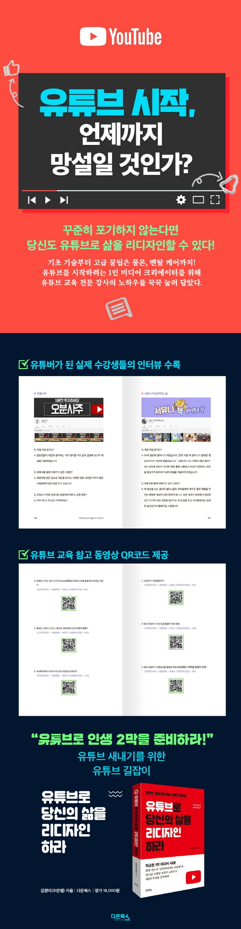 누구나 시작만 하면 새로운 ‘파이프라인’이 되어줄 수 있는 유튜브! 어떻게 시작하고, 어떻게 제작하고, 어떻게 마케팅해야 부수입을 창출할 수 있을까? 시간과 노력을 투자한 만큼 반응과 수익이 돌아오지 않았을 때 멘탈 관리는 어떻게 해야 할까? 이 책은 유튜브를 시작하는 과정부터 멘탈 관리 등 작가의 노하우가 가득 담겨 있다. 또한, 이 책은 새롭게 유튜브를 시작하는 새내기는 물론, 유튜브로 제2의 인생을 시작하려는 중장년들도 쉽게 기술을 익힐 수 있는 내용을 담고 있다. 스마트폰 하나만 있다면 내가 있는 어느 곳이든 1인 방송국이 될 수 있는 시대! 유튜버 전문 강사로 우뚝 선 작가의 모든 것이 담긴 이 책으로 유튜브 교육 기본부터 고급 기술을 익히고 잠들어 있던 크리에이터로서의 끼를 발산할 수 있다. 작가에게 유튜브 교육을 받고 유튜버 활동을 이어가는 10인의 이야기를 통해 유튜버 도전을 더 이상 미루지 말자!