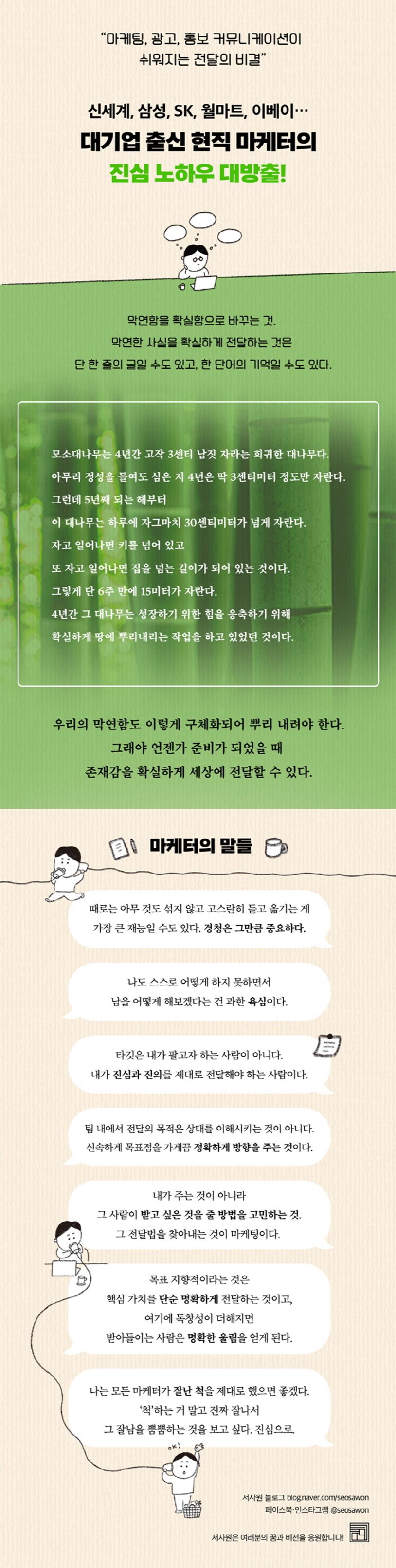 필자는 마케팅은 결국 전달이고 소통이라고 말한다. 다양한 방법론, 더 다양한 프로젝트를 통해 이 일을 하다 보니 고객과의 소통이 얼마나 중요한지 다시 한 번 알 수 있었고, 어떻게 고객에게 전달하면 가장 쉽고 빠르게 이해할 수 있을까를 매시간 고민하게 되었단다.