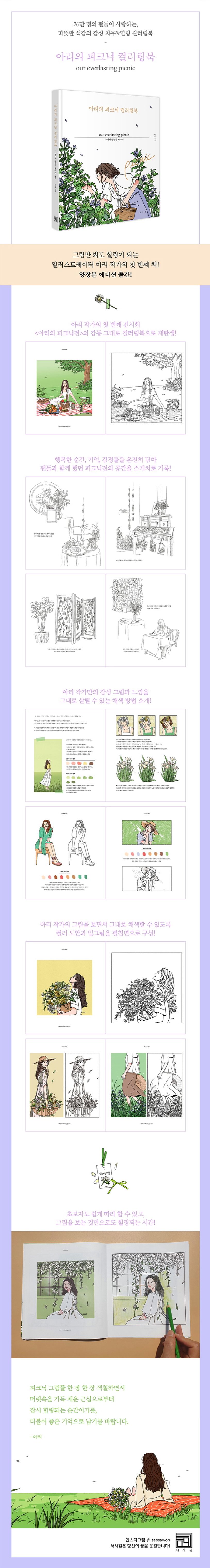 이 책은 그녀가 최근 6월 한 달 여간 단독으로 진행했던 첫 전시회 〈아리의 피크닉전〉에 전시했던 그림들과 추가로 그린 그림들을 모아서 엮은 컬러링북입니다.