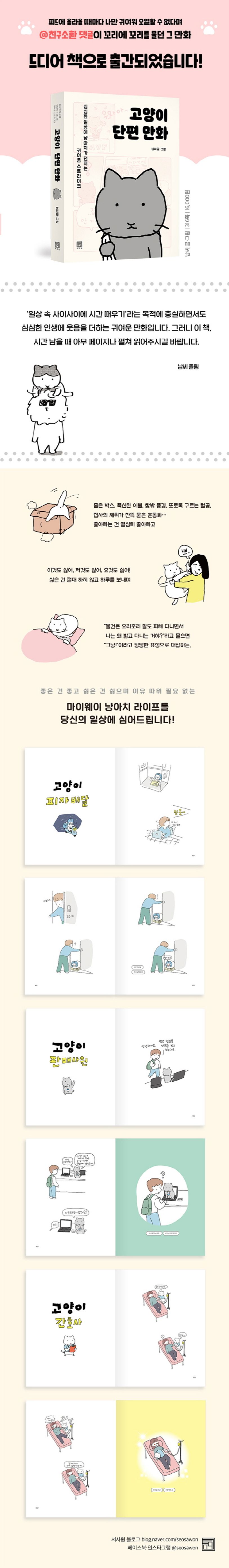 열심히 준비해 주간으로 연재한 장편 만화는 연재를 중단하게 되고, 연재 사이사이에 시간을 때우려고 올리던 단편 만화는 책으로 나온 걸 보며 정말 인생은 마음대로 되는 게 없다고 남씨는 말한다. 하지만 ‘일상 속 사이사이에 시간 때우기’라는 목적에 충실하면서도 심심한 일상에 웃음을 더하는 귀여운 만화이니, 생각날 때마다 아무 페이지나 펼쳐 읽어주기를 권한다. 이 책 『고양이 단편 만화』가 마음대로 되는 거 하나 없는 세상살이에서 귀여움과 힐링이 필요할 때마다 들여다보면 행복해지는 보물 상자가 되기를 바란다.