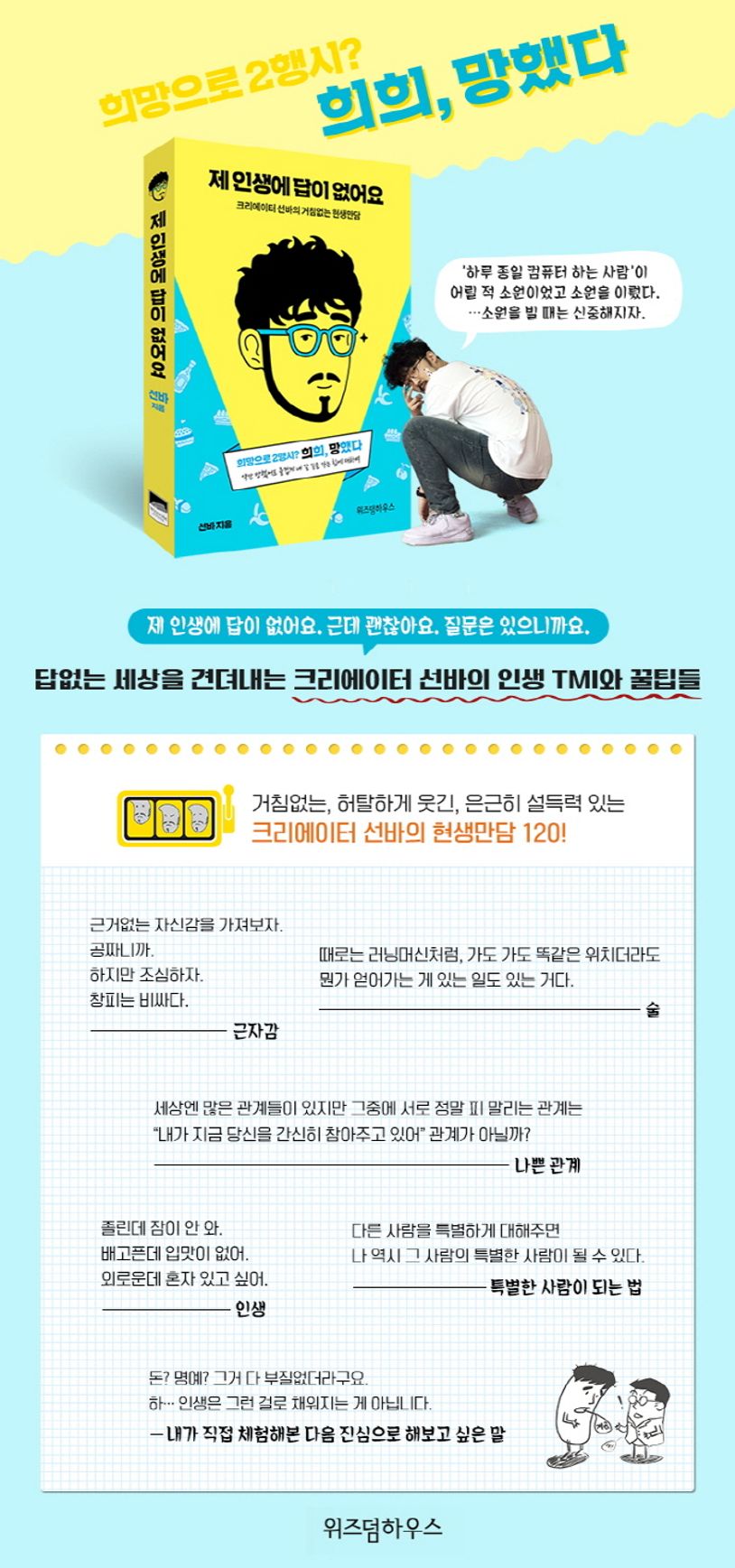 50만 구독자의 웃음을 책임지는 유튜버 선바의 만담 에세이 『제 인생에 답이 없어요』. 대학을 10년째 다니고 있는 학생이자 게임 스트리밍 전문 유튜버 선바가 방송으로는 못다 한 드립과 생각을 엮은 책으로, 약간 망했어도 즐겁게 내 갈 길을 가는 힘에 대해 이야기한다. 1인 크리에이터로 사는 법, 인터넷 방송과 유머에 대한 그만의 지론은 물론, 인생이 적성이 아닌 사람들을 위한 삶의 TMI와 꿀팁을 풀어놓는다.