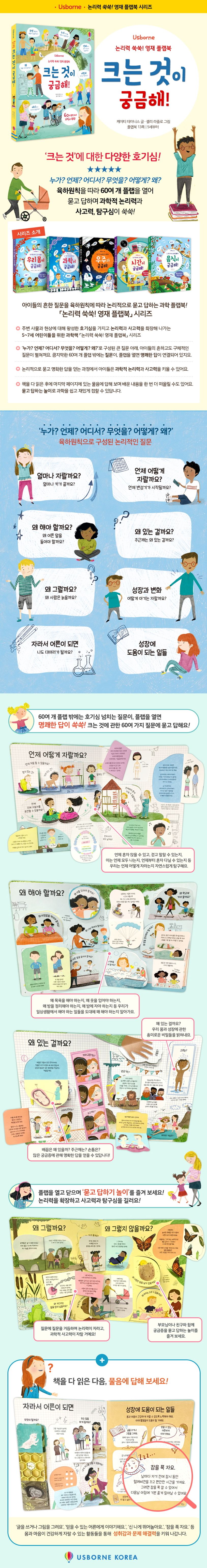 큼직한 플랩에 간결한 질문과 명쾌한 답이 연결되어 있어, 60여 가지 궁금증을 쉽게 풀 수 있어요. 부모님이나 친구와 함께 육하원칙에 따라 구분된 궁금증을 묻고 답해 보며 놀이 형식으로 즐겨 보세요. 이 과정에서 아이들은 과학에 흥미를 느끼고 과학적 논리력이 쑥쑥 자라나지요. 아이들은 이 책의 마지막 페이지에는 ‘글을 쓰거나 그림을 그려요’, ‘믿을 수 있는 어른에게 이야기해요.’, ‘신 나게 뛰어놀아요.’, ‘잠을 푹 자요.’ 등 몸과 마음이 건강하게 자랄 수 있는 활동들을 소개하고 있어요. 이러한 활동을 통해 몸과 마음의 성장을 자연스럽게 받아들이고 스스로 알아 가면서 문제 해결력을 키우고 성취감을 얻을 수 있답니다.