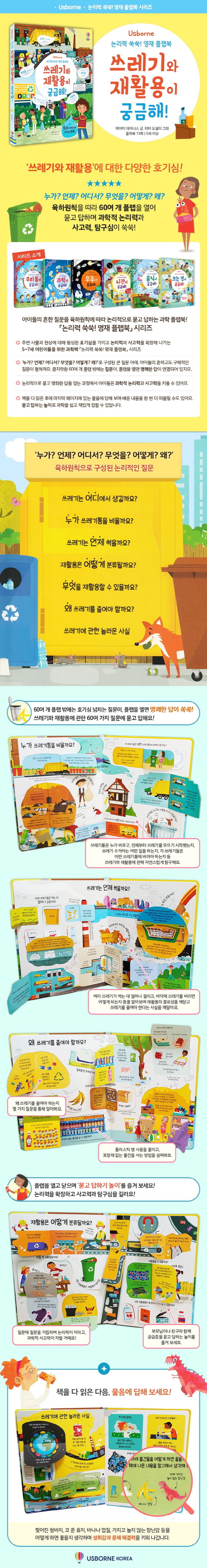 주변 사물과 현상에 대해 왕성한 호기심을 가지고 논리력과 사고력을 확장해 나가는 5~7세 어린이들을 위한 과학책 「논리력 쑥쑥! 영재 플랩북」시리즈가 출간되었어요. 이 시리즈는 한 권당 우리 몸, 우주, 과학, 음식, 시간, 성장 등의 주제를 담아, 이와 관련한 60여 가지 궁금증을 육하원칙에 따라 풀어 나가요. ‘누가? 언제? 어디서? 무엇을? 어떻게? 왜?’로 구성된 큰 질문 아래, 아이들의 흔하고도 구체적인 질문이 펼쳐져요. 큼지막한 60여 개 플랩 밖에는 질문이, 플랩을 열면 명쾌한 답이 연결되어 있지요. 논리적으로 묻고 명확한 답을 얻는 과정에서 아이들은 과학적 논리력과 사고력을 키울 수 있어요. 책을 다 읽은 후에 마지막 페이지에 있는 물음에 답해 보며 배운 내용을 한 번 더 떠올릴 수도 있어요. 묻고 답하는 놀이로 쓰레기와 재활용에 대한 지식들을 쉽고 재밌게 접할 수 있답니다.