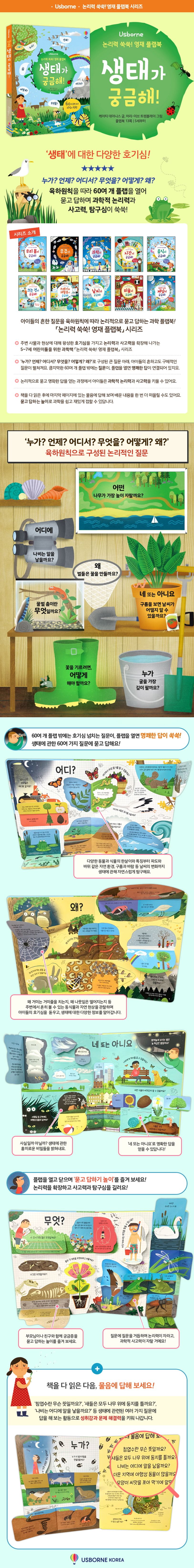 ‘어디에서 올챙이를 찾을 수 있을까요?’, ‘다람쥐는 도토리를 어디로 가져갈까요?’, ‘왜 나뭇잎은 떨어질까요?’, ‘바위와 화석은 무엇이 다를까요?’, ‘달도 태양만큼 클까요?’, ‘새는 얼마나 높이 날 수 있을까요?’ 등 아이들이 가장 궁금해하고 흔히 묻는 60여 가지 질문으로 궁금증을 풀어 가요. 플랩 밖에 육하원칙으로 구분된 질문을 따라 플랩을 열어 보며 자연 속 동식물에 관련된 다양한 정보, 날씨와 자연 환경 등 생태에 관해 자연스럽게 탐구하지요. 이와 더불어 애벌레는 어떻게 나비로 변하는지, 꽃을 기르려면 어떻게 해야 하는지, 거미는 왜 거미줄을 치는지 등 생태에 관련된 여러 가지 궁금증에 대한 대답을 알아 갑니다. 또한 사실일까? 아닐까? 생태에 관한 흥미로운 비밀들을 밝혀내요. 질문에 대해 ‘네 또는 아니요’로 명확한 답을 얻으며 생태에 대한 호기심을 키워 나갈 거예요.