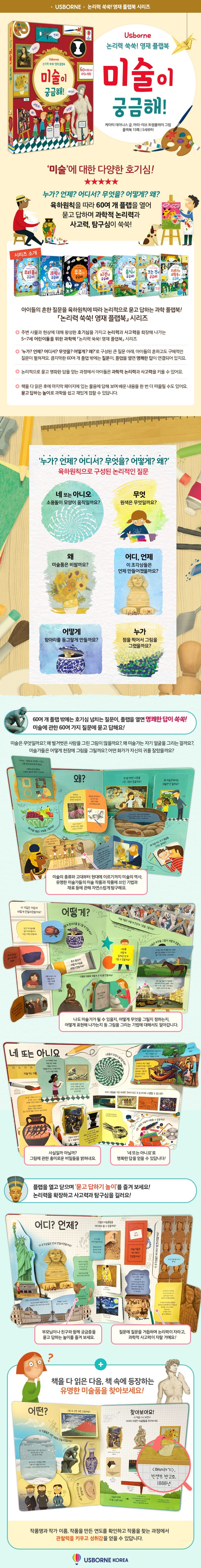 ‘미술은 무엇일까요?’, ‘왜 벌거벗은 사람을 그린 그림이 많을까요?’, ‘왜 미술가는 자기 얼굴을 그리는 걸까요?’, ‘언제부터 미술가들이 작품에 서명하기 시작했을까요?’ ‘미술가들은 어떻게 천장에 그림을 그릴까요?’, ‘어떤 화가가 자신의 귀를 잘랐을까요?’ 등 아이들이 가장 궁금해하고 흔히 묻는 60여 가지 질문으로 궁금증을 풀어 가요. 플랩 밖에 육하원칙으로 구분된 질문을 따라 플랩을 열어 보며 고대부터 현대에 이르는 미술의 종류와 역사, 유명한 미술가들의 미술 작품과 작품에 쓰인 기법과 재료 등에 관해 자연스럽게 탐구하지요. 이와 더불어 나도 미술가가 될 수 있을지, 어떻게 무엇을 그릴지 정하는지, 어떻게 표현해 나가는지 등 그림을 그리는 과정에 대해서도 알아갑니다. 또한 사실일까? 아닐까? 그림에 관한 흥미로운 비밀들을 밝혀내요. 질문에 대해 ‘네 또는 아니요’로 명확한 답을 얻으며 미술에 대한 호기심을 키워 나갈 거예요.
