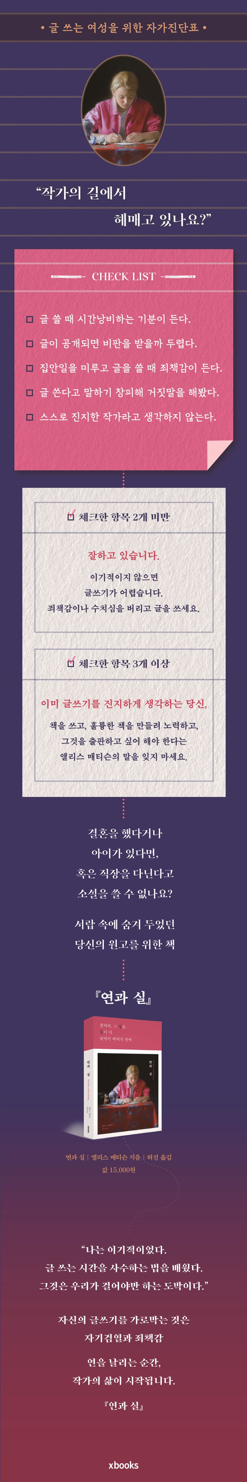 당신에게 단 한 권의 글쓰기 책만이 허락된다면 이 책을 선택하라. 돈을 버느라 정신이 없을 때, 집안일에 깔려서 숨을 쉴 수 없을 때, 글쓰기가 시간낭비처럼 느껴질 때야말로 당신이 글을 써야 하는 순간이다. 앨리스 매티슨의 『연과 실』에는 남편에게 아이를 맡기고 글을 쓰기 시작했던 순간부터 수많은 출판사들에게 퇴짜를 맞았던 순간까지, 소설가가 되기 위해 필요한 시간과 과정에 대한 내용이 빼곡하게 담겨 있다.