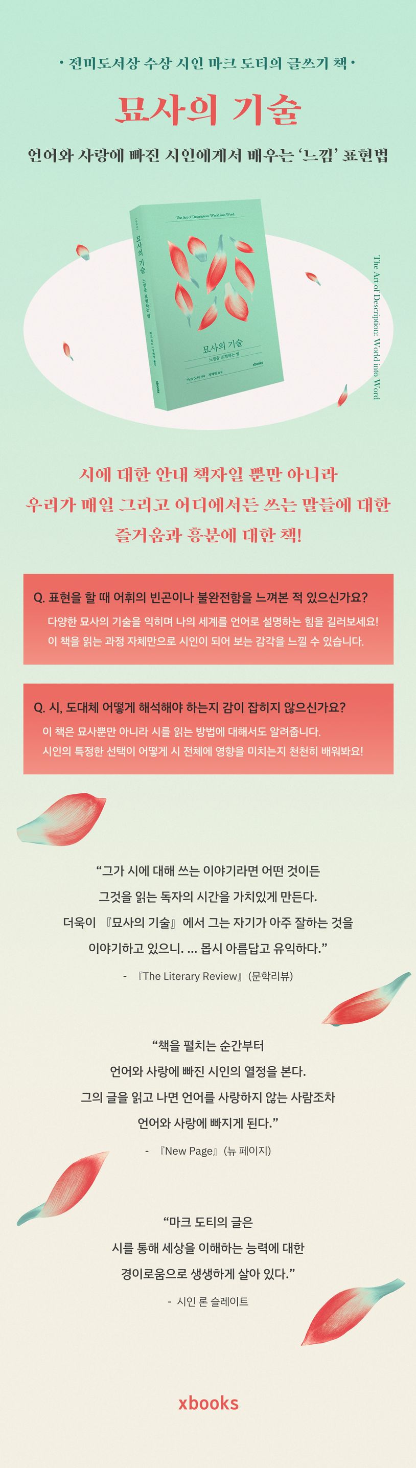 『묘사의 기술 -느낌을 표현하는 법』은 전미도서비평가협회상, 전미도서상을 수상한 미국 시인이자 국내에 처음 소개되는 마크 도티(Mark Doty)의 책이다. 그는 시 속의 구체적인 단어와 감각, 묘사가 어떻게 작동하는지 탐구하며 언어의 아름다움이 발생하는 과정을 파헤친다. 감각적인 해설을 통해 시에 정신적으로 참여하고 이해함으로써, 독자는 묘사뿐 아니라 시를 읽는 법에 대해서도 배울 수 있다.