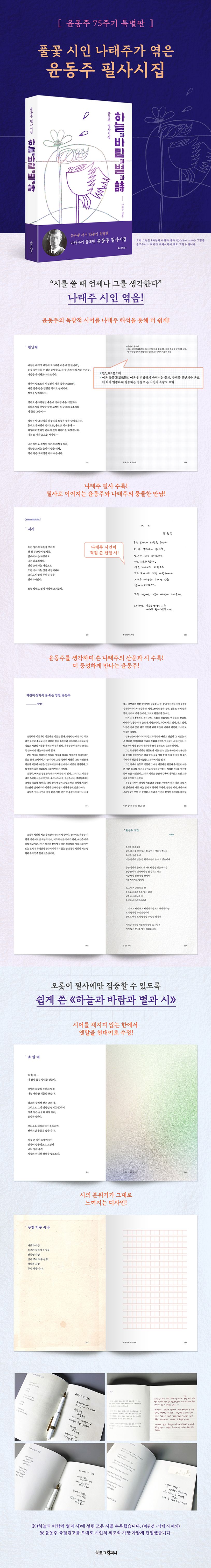 이렇듯 윤동주 시인과 깊은 인연이 있는 나태주 시인이 윤동주 서거 75주기 특별판 윤동주 필사시집 《하늘과 바람과 별과 시》에 참여했다. 현대어와 달라 해석이 분분한 시어(詩語)에 대해서도 나태주 시인이 직접 각주를 달고 편집을 진행했다. 평생을 윤동주를 생각하며 시를 쓴 나태주이기에 시 한 편, 시어 하나에도 그의 애정이 차곡차곡 담겨 있다. 나태주 시인이 직접 필사한 〈서시〉, 〈편지〉, 〈고향 집〉도 수록되어 있어 시가 더 가깝게 와닿으며 억울하게 세상을 떠난 윤동주 시인을 나태주 시인이 포근하게 안아주는 것 같은 뭉클함마저 전해진다. 나태주 시인이 윤동주 시인을 직접 소개하는 머리글 ‘여전히 살아서 숨 쉬는 생명, 윤동주’와 시 〈윤동주 시인〉도 함께 실려 있어 시를 사랑하는 사람이라면 소장할 가치가 충분한 책이다.