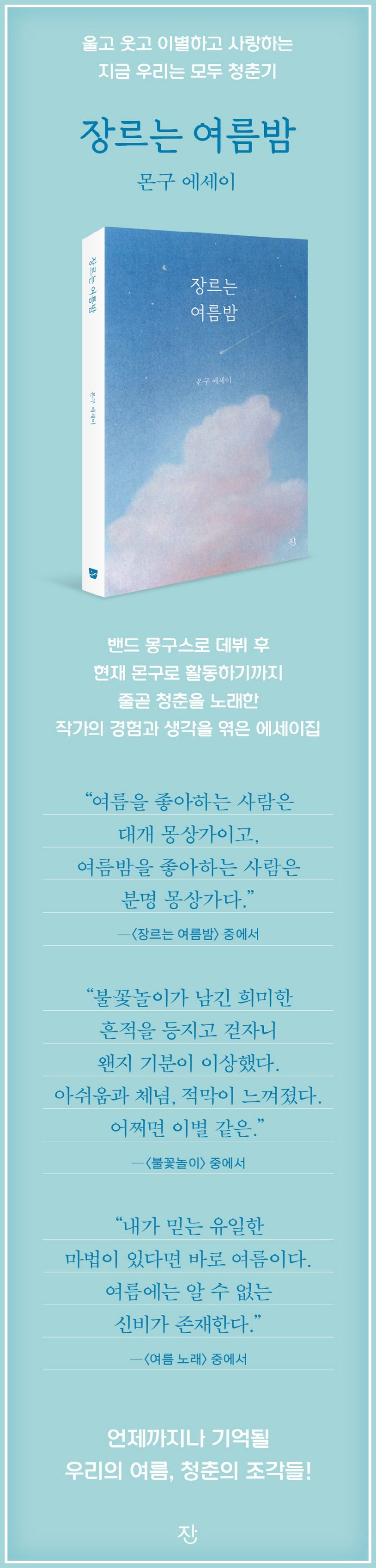 《장르는 여름밤》은 밴드 몽구스로 데뷔 후 현재 몬구로 활동하기까지 줄곧 청춘을 노래한 작가의 경험과 생각을 엮은 에세이집이다.