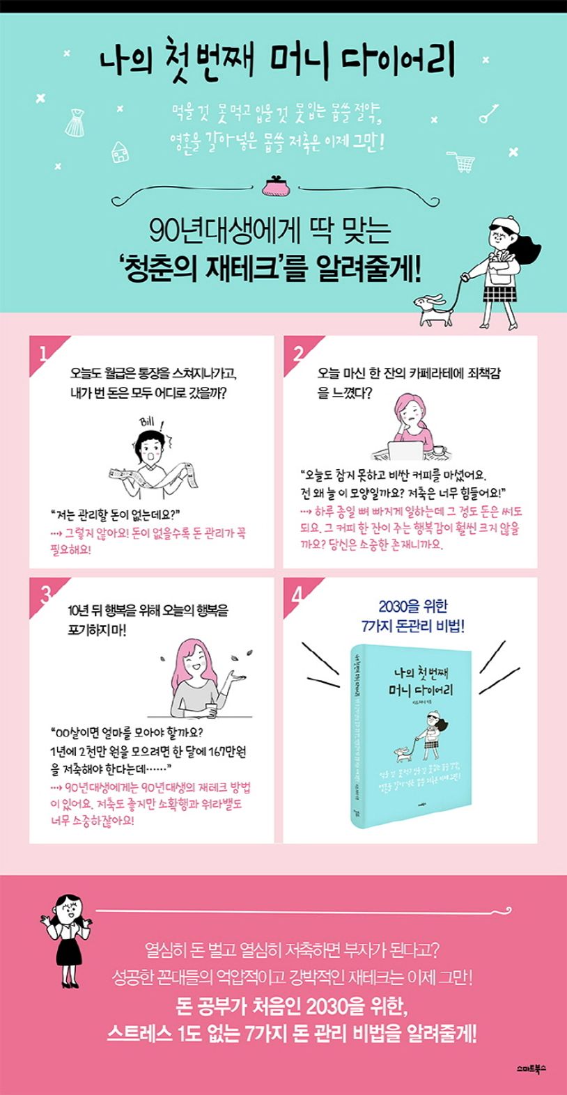 90년대생에게는 90년대생의 재테크 방법이 있다! 젊은 저자가 같은 세대인 2030에게 건네는 솔직하고 정직하고 진실한 재테크 조언. ‘열심히 일하는데 왜 늘 돈이 부족할까?’ 열심히 일하는 직장인들이 품는 최고의 수수께끼를 속 시원하게 풀어주고, 경제적으로 독립하여 처음으로 내 돈을 내가 관리하기 시작하는 2030들에게 스트레스 받지 않는 돈 관리의 비법을 전해준다. 성공한 ‘꼰대’들이 들려주는 ‘열심히 돈 벌고 열심히 저축하면 부자가 된다’ 식의 억압적이고 강박적인 재테크 대신에 나는 누구인지, 그리고 나에게 진정한 행복이란 무엇인지를 되새김질하면서 하루하루의 소확행과 나 자신을 우선순위에 놓는 재테크라는 기치 아래 7가지 돈 관리 비법을 찬찬히 알려준다. 돈을 둘러싼 내용이지만 읽다보면 삶이란 무엇이며, 행복이란 무엇인지를 곰곰이 생각하게 만드는, 에세이 스타일의 대단히 독특한 재테크서이다.