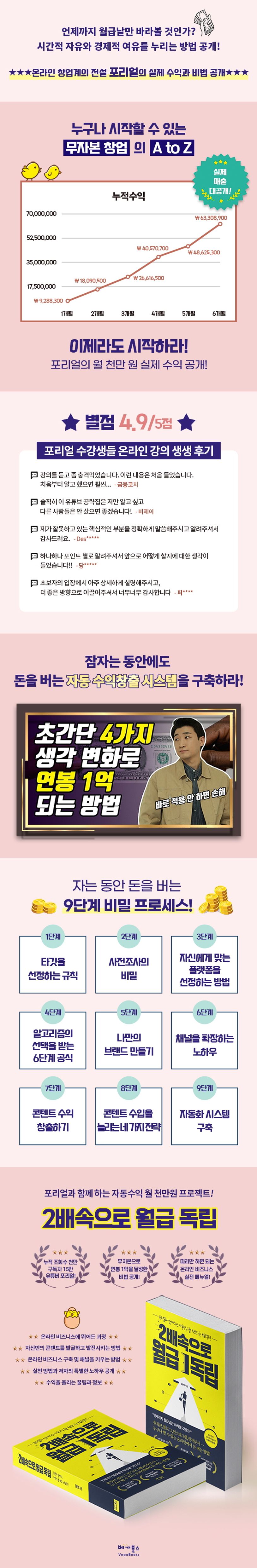 39,000원, 29,000원, 39,000원 또 39,000원… 저자가 잠자는 동안에도 온라인에서는 그를 위해 일하는 시스템이 돌아가고 있다. 어제는 94달러, 오늘은 72달러… 달러로 돈을 벌어오는 시스템도 만들었다. 『2배속으로 월급 독립』의 저자 포리얼(김준영)은 유튜브, 블로그, 인스타그램, 전자문서 등 몇 가지 시스템을 구축해 돈을 버는 1인 온라인 창업가다. 무자본에서 시작한 지 2년이 채 되기도 전에 한 달에 1천만 원을 벌어들이고 있다.