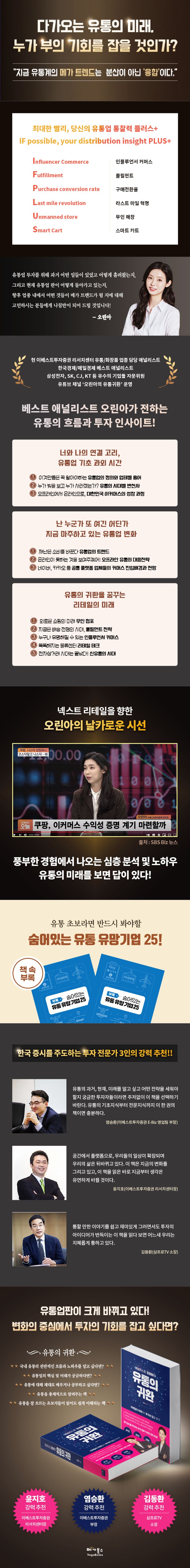 파트1 부분에서는 유통업이란 정확히 무엇인지 그리고 각 시대별로 어떻게 변천해왔는지를 담고 있으며 파트2에서는 지금 현재 우리가 마주하고 있는 국내외 최신 트렌드를 소개하고 있다. 파트3은 앞으로 펼쳐질 유통업의 미래상과 향후 수년을 이끌어갈 메가 트렌드에 대해 분석한다. 또 특별 부록으로 〈숨어있는 유통 섹터 유망 기업 25〉를 정리하고 있어 국내외 유통 기업의 이해에 도움을 주고 있다. 『애널리스트 오린아의 유통의 귀환』은 빠르게 변화하는 국내외 유통 생태계의 과거와 현재를 자세히 진단하고 과감하게 미래를 예측함으로써 성공적인 투자 전략을 수립하는 데 꼭 필요한 인사이트를 제시하고 있다.