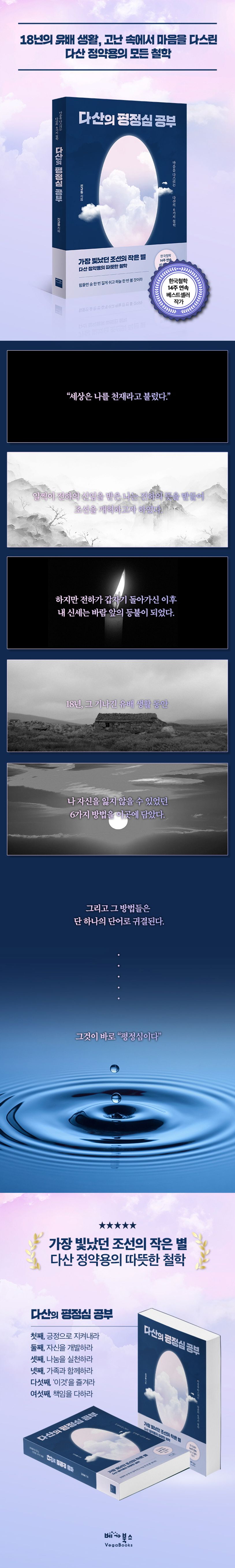 『다산의 평정심 공부』는 이렇게 고민하는 당신의 마음을 이끌어주는 친절한 가이드다. 18년, 그 긴 유배 생활 동안 정제된 다산의 맑고 따스한 철학. 그가 남긴 6가지 이정표를 따라 여행을 떠나다 보면, 어느샌가 단단히 자리 잡은 당신의 마음을 발견하게 될 것이다.