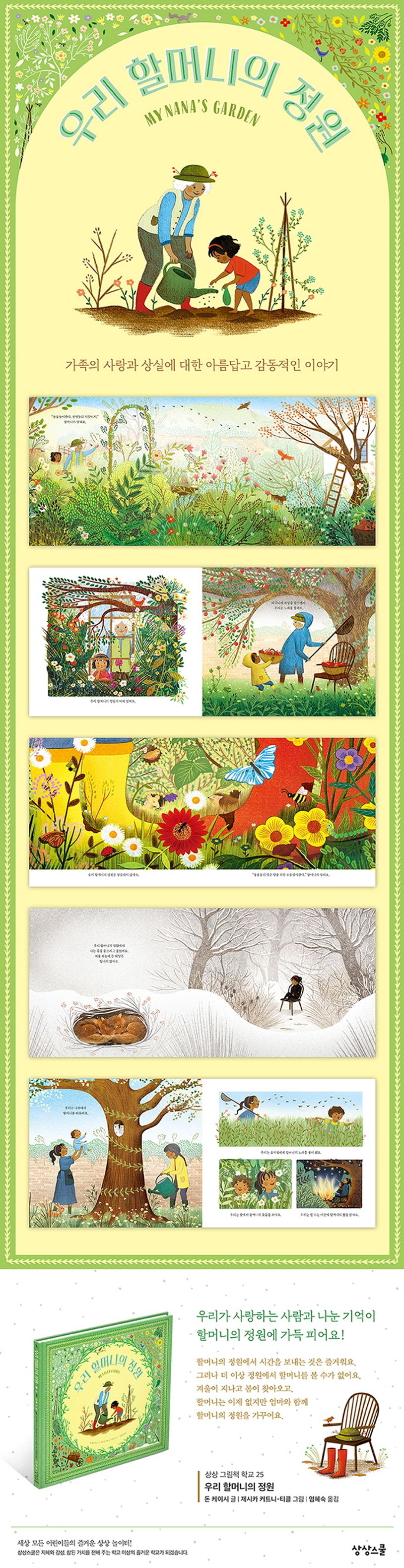 『우리 할머니의 정원』에는 할머니, 엄마, 손녀딸에 이르는 3대, 4대가 함께하는 멋진 사랑과 아름다움이 가득합니다. 꿀벌과 새들이 날아오고 꽃이 피고 나무가 자라는 정원의 풍경은 가족들이 항상 연결되어 있음을, 끊임없이 사랑하고 있음을 표현하는 공간을 의미하고 있습니다.