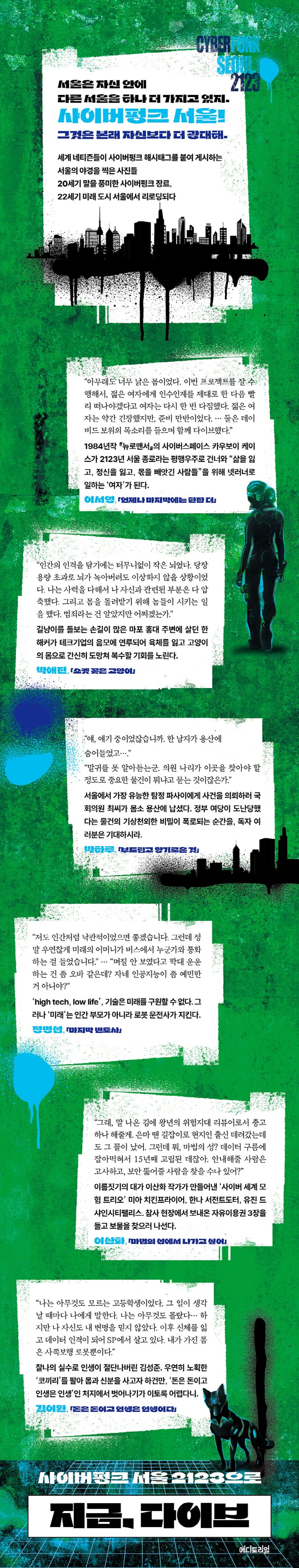 현재 우리 장르문학 신에서 맹활약 중인 여섯 작가가 이 공동선집에 참여했다. 다채롭고 화려한 이력에 걸맞게 개성적인 작품들을 꾸준히 발표하고 있는 작가들이다. 『지금, 다이브: 사이버펑크 서울 2123』(이하 『지금, 다이브』)는 서울이라는 메가시티를 배경으로 삼는 만큼 각 단편 속 주인공이 겪는 혹은 해결해야 하는 사건은 그들이 거주하는 자치구의 특징과 연관되어 있다.