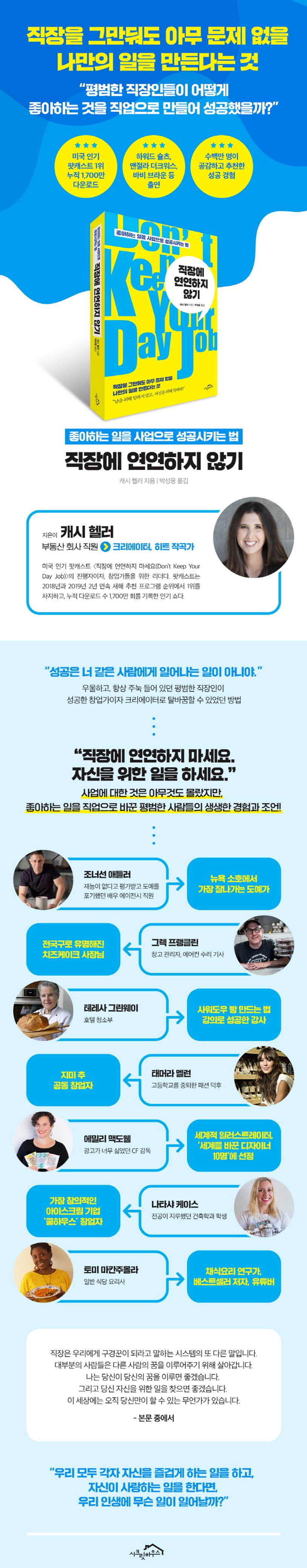 책《직장에연연하지않기》의저자이자,인기팟캐스트〈직장에연연하지마세요(Don’tKeepYourDayJob)〉의진행자캐시헬러는‘좋아하는일을사업으로성공시키는법’에대해말한다.어떻게좋아하는일을찾을수있는지,어떻게좋아하는일을사업으로만들수있는지,어떻게사업을성장시킬지,어떻게삶의질을높일수있는지에대한이야기를전하고있다.그녀는인기팟캐스트진행자일뿐만아니라,TV드라마와광고에삽입되는라이센스음악을작곡하는히트작곡가이다.또한작곡가들을위한에이전시회사를운영하는창업가이며,온라인강의를개설해다른아티스트들의커리어를성장시키는코치이기도하다.캐시의팟캐스트는2018년,2019년2년연속추천프로그램순위1위를차지하고,누적다운로드수1700만회를넘긴인기프로그램이다.스타벅스의하워드슐츠회장,전세계베스트셀러《그릿》의저자앤절라더크워스등이출연하는유명프로그램이며,〈포브스〉와〈뉴욕타임스〉에도여러번소개됐다.