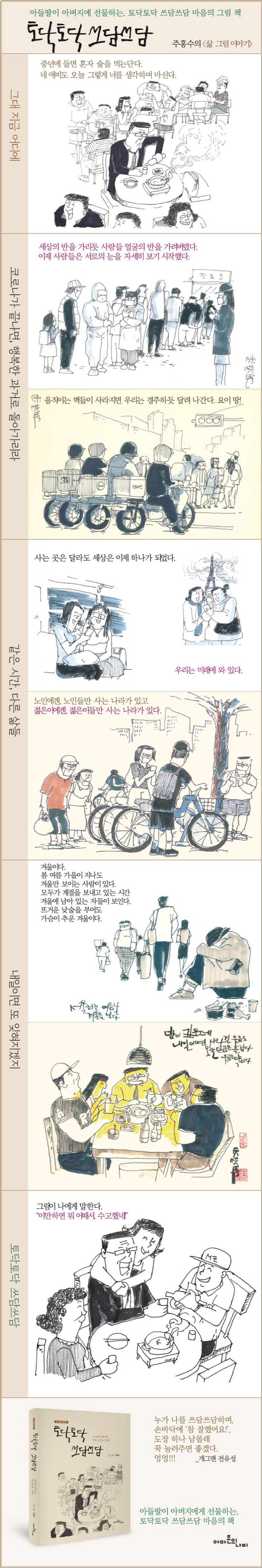 스치듯 지나친 우리 삶을 기록한 그림 에세이집이다. 일상에서 흔히 만나는 우리네 삶의 모습을 따뜻한 애정 담아 그렸다. 그림이 익살스럽기도 하지만, 그 이면의 정서가 때로는 안타깝고, 때로는 아릿하다. 그럼에도 절망은 없다. 희망 고문하듯 헛된 꿈을 그리지도 않는다. 힘든 날들, 때로는 고통스러울지라도 한 잔 술에 훌훌 털고 또 내일을 시작해야 하는 나의 이야기, 고개 들어 둘러보면 바로 옆에서 옷깃 스쳐 닿는 우리네 이야기이다.