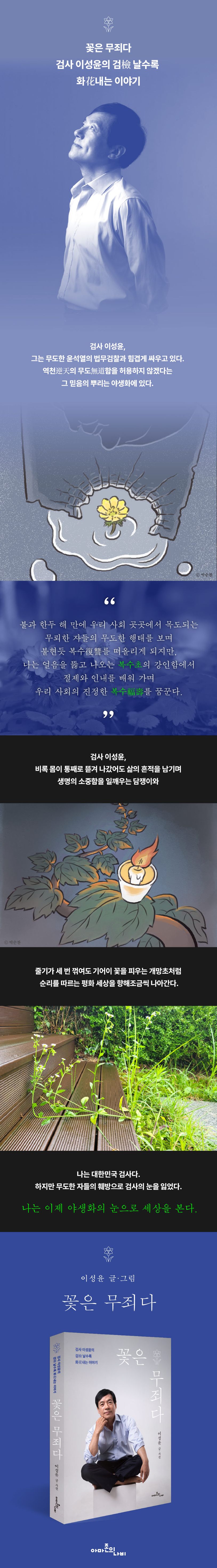 사람들은 억울한 처지에 처하면 저간의 사정을 과장되게 토로하며 결백을 주장한다. 하지만 결백한 사람은 애써 자신을 변명하지 않는다. 현재 겪는 화(禍)에 화(火)내는 자는 스스로의 허물을 덮으려는 사람이다. ‘검(檢) 날수록 화(花)내는’ 날, 만 리를 날아 세상을 품는 사람은 거짓도 허세도 없는 꽃을 통해 자신을 올곧게 세운다. 「꽃은 무죄다」는 검사 이성윤이 아내와 함께하는 동행의 시간을 위해 ‘꽃개’ 역할을 자임한 후, 꽃을 통해 자신을 성찰하고, 꽃을 통해 살피게 된 세상사를 담담히 서술한 책이다.
