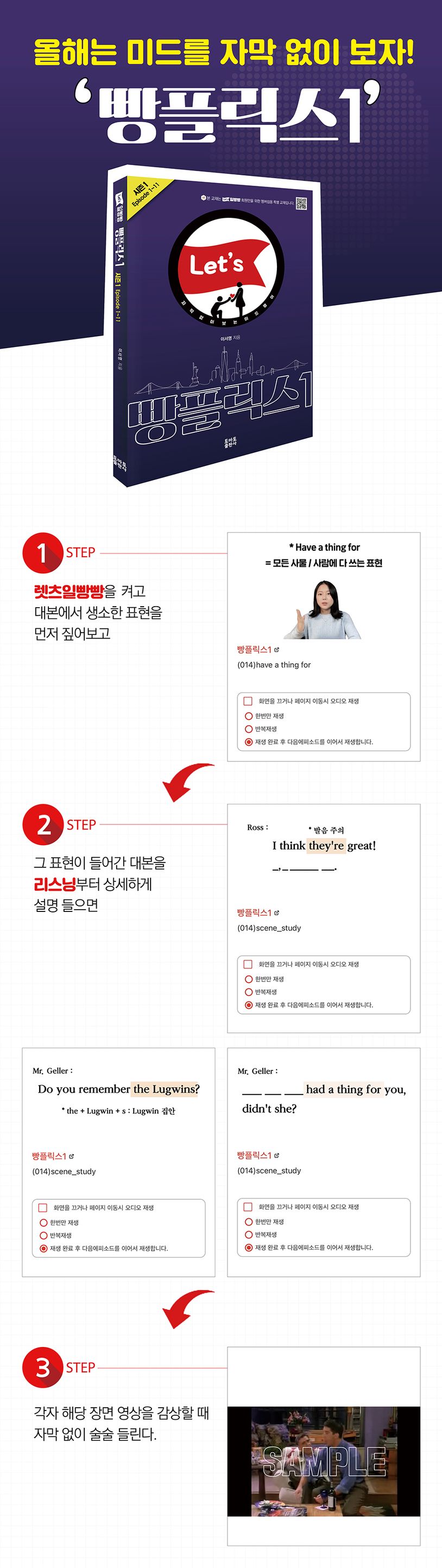 ‘렛츠일빵빵’에서 제공하는 세 번째 강의 ‘빵플릭스1’은 위 세 가지 문제점을 해결하기 위한 입체적인 강의를 제공하며 학습자들의 리스닝 반복 훈련을 돕는다. 특히 영화 대본에 담긴 의미를 전달함으로써 일정 수준의 영어 중급자들에게만 국한되어 있는 ‘미드 영어 공부’를 ‘기초학습자’들도 쉽게 접근할 수 있도록 눈높이를 확 낮춘 새로운 미드 영어 학습 프로그램이다.