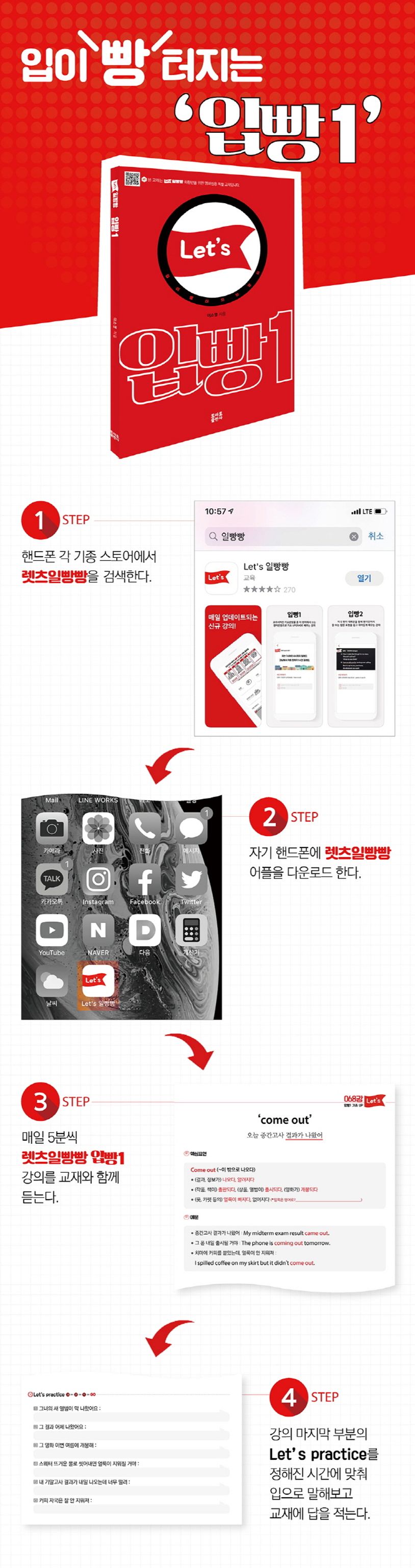 기초회화와 비즈니스 영어회화 전문 강사로 활동하신 이소영 강사님의 Let’s 일빵빵 하루 5분 입빵 강의와 함께 영린이들이 놓치기 쉬운 간단하고 디테일한 실제 표현들을 어렵지 않게 조금씩 업그레이드할 수 있습니다.