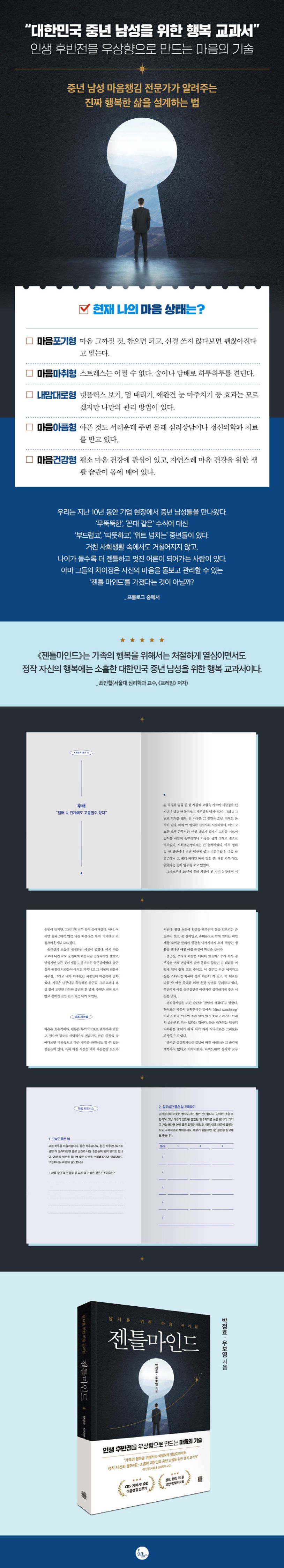 인생 후반전에 들어선 남자는 눈물이 많아진다. 잘 살기 위해 무던히 노력해왔으나 누군가 행복하냐고 물으면 그렇다고 자신 있게 대답이 나오지 않는다. 변화보단 안정을, 여가보단 생계를, 개인보다는 가정과 조직을 선택해야 했던 중년 남성에게 ‘행복’은 배부른 고민이기 때문이다. 이렇듯 열심히는 사는데 행복하지 않은 남자들을 위해 《젠틀마인드》를 토마토출판사에서 펴낸다. 마음도 몸처럼 꾸준히 관리하지 않으면 퇴화 속도가 빨라진다. 그 결과 직장과 가정에서는 물론 스스로에게도 심리적 거리감이 생기며 고독하고 불안한 중년을 보내게 된다. 평소 ‘마음’이라는 단어와 거리가 먼 중년 남성이 일상에서 편하고 쉽게 마음에 접근할 수 있도록 ‘일-관계-자아’ 순서로 마음 관리법을 소개한다. 인생 전반전은 오르락내리락 굴곡이 많았으나 인생 후반전은 우상향으로 장식하고 싶은 남자들에게 권한다.