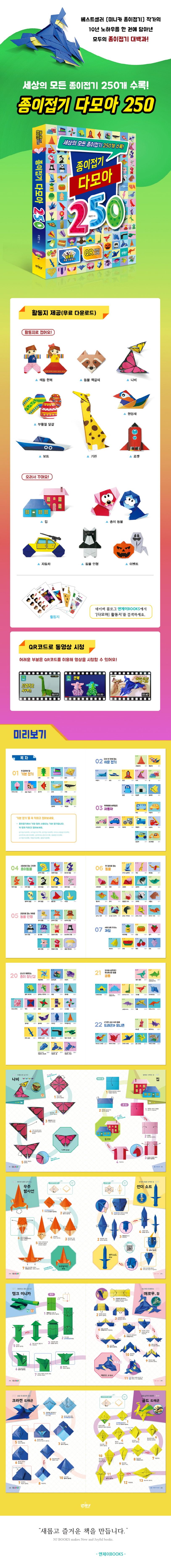 『종이접기 다모아 250』은 저자가 10년간 집필한 모든 도서를 한 권으로 총망라한 종이접기 백과입니다. 모두가 좋아하고 꼭 접어보고 싶어 하는 종이접기를 하나하나 모아 250개로 정리하여 책에 수록했어요. 많은 작품을 효과적으로 수록하기 위해 접는 과정을 줄이고 쉽고 친절하게 설명하고 있어요. 또한 어려운 부분은 QR코드를 이용해 영상을 시청할 수 있고, 귀여운 활동지를 무료로 다운받아서 프린트하면 예쁘고 멋진 작품을 만들 수 있어 상당한 만족감을 느낄 수 있는 도서입니다.