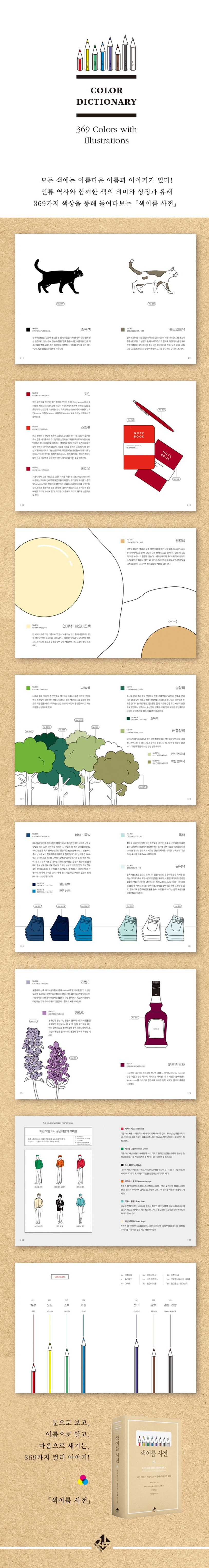 『색이름 사전』은 일본의 그래픽디자이너이자 수채화가 아라이 미키와 지노출판 감수ㆍ편집진의 콜라보로 탄생한 색채 그림책입니다. 3년여 동안의 번역 및 감수, 편역, 보완 과정을 거쳐 한국 독자들에게 꼭 맞게, 우리말로 새롭게 풀어쓰고 구성했습니다. 우리가 일상에서 사용하는 색이름이나 관용적으로 사용하는 색이름, 동서양의 전통 색이름 등 369가지 색들의 유래와 역사에 대한 해설부터, 아기자기 귀여운 그림과 함께 구성된 CMYK 컬러 샘플까지 오롯이 만나볼 수 있습니다. 손바닥만 한 크기, 지금까지 본 적 없는 올컬러, 올일러스트로, 더한층 선명하고 매력적인 컬러의 세계를 풀어낸 이 책을 통해 아름다운 색, 아름다운 색이름, 그 하나하나가 지니고 있는 아름다운 이야기까지 독자 여러분 각자의 감성으로 즐겨주시면 좋겠습니다.