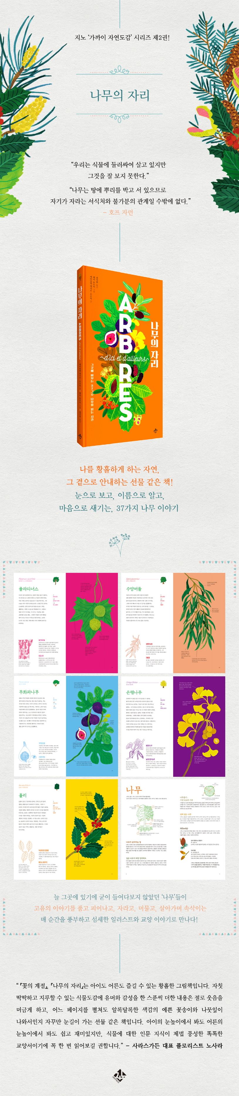 추운 날씨에도 아름다운 꽃을 피우는 동백나무, 가을을 노랗게 물들이는 은행나무…… 『나무의 자리』는 지노에서 새롭게 선보이는 ‘가까이 자연도감’ 시리즈의 런칭작으로, 자신의 자리에서 묵묵히 자라나는 나무 37종을 소개한 책입니다. 여행이나 영상, 예술 작품 등을 통해 한국 독자에게 대부분 친숙한, 프랑스에서 가장 많이 자라는 나무들을 시적인 글과 유용한 정보, 그리고 마티스를 연상시키는 독특한 삽화로 더함도 덜함도 없이 엮었습니다. 기존 책에서 볼 수 없었던 황홀한 색채의 나무들이 가득합니다. 머리가 찡할 정도로 아득히 맑은 날 그 계절의 햇살을 가득 머금은 나무 숲 사이에 서 있는 느낌입니다. 일상의 작은 위안과 설렘, 기쁨이 필요한 순간이라면 꼭 한 편 펼쳐보세요. 늘 우리 곁에 있었지만 잘 알지 못했던 자연의 내밀한 속삭임에 귀를 기울이며, 자연스레 달콤한 쉼을 만끽할 수 있을 것입니다.