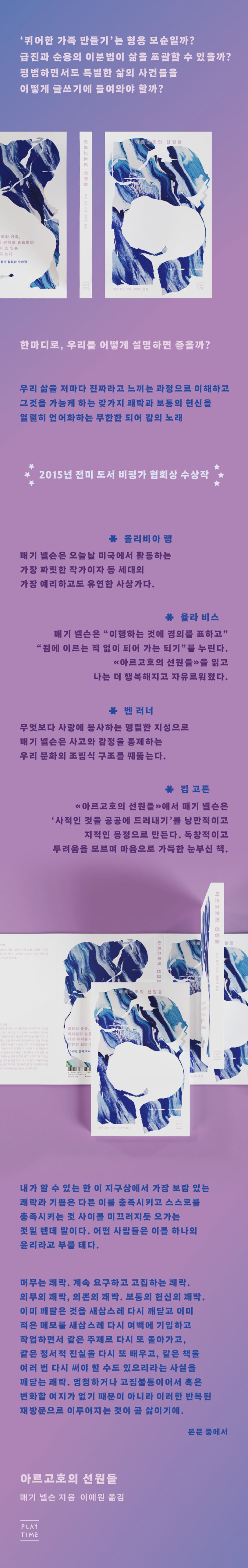 시, 회고록, 비평을 넘나들며 장르를 구부러뜨려 온 매기 넬슨의 대표작. 파트너 해리 도지와 사랑에 빠진 시점부터 해리 어머니의 사망과 넬슨 자신의 출산에 이르는 몇 년간을 소재로 퀴어함, 사랑, 트랜지션, 모성에 대한 문화적 가정들에 질문을 던지고 자신만의 답을 구하는 과정을 글쓰기로 재생한다.