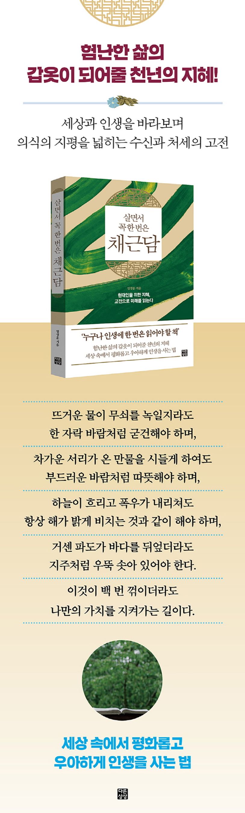‘나물 뿌리 이야기’라는 채근담의 뜻대로 이 책은 나물 뿌리와 닮았다. 처음에 읽어보면 투박하고 거친 느낌이지만 읽으면 읽을수록 자연이 지닌 본연의 쌉쌀한 단맛이 난다. 항상 곁에 두고 꺼내 읽어보면 그 깊은 맛을 느낄 수 있을 것이다.