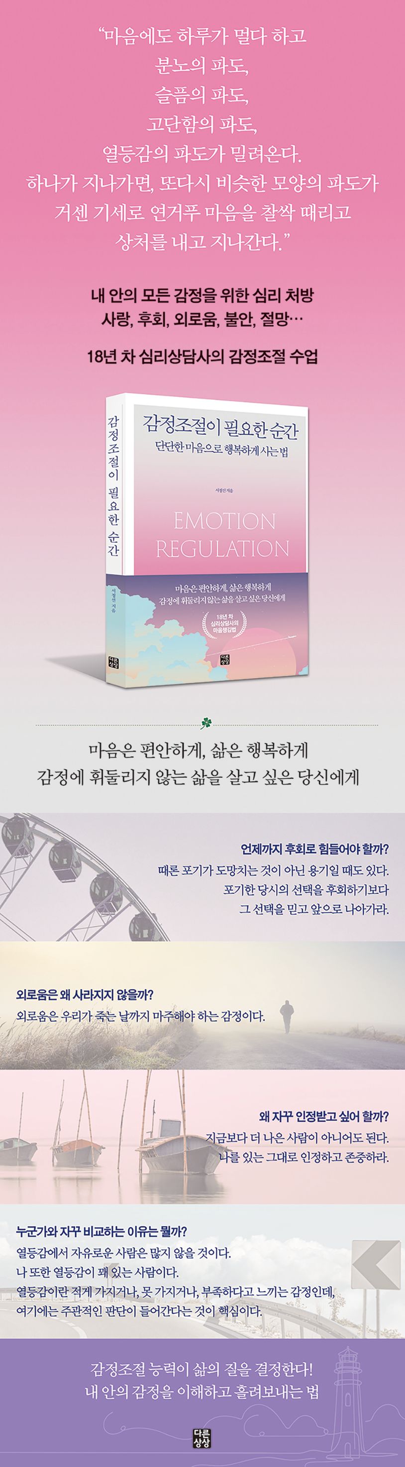 우리는 살아가면서 끊임없이 감정조절이 필요한 순간을 맞닥뜨린다. 저자와 함께 내 마음속 깊은 곳에 자리 잡은 감정들을 이해하고 자신을 진정으로 사랑할 수 있게 된다면, 우리는 단단한 마음의 중심을 잡고 자기 인생의 진짜 주인공이 되어 보다 안정되고 행복한 삶을 살아갈 수 있을 것이다.