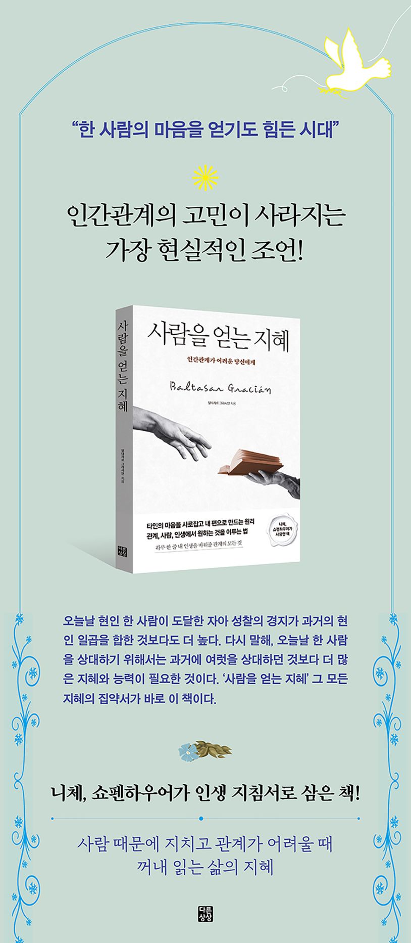 인간관계를 다루는 책들이 넘쳐나는 시대에 그라시안의 저서가 단연 사랑받는 이유는 뭘까? 일반적인 책에서 제시하는 항목들은 현실과 거리가 먼 이상론에 그쳐 금세 기억 저편으로 사라지기 일쑤다. 하지만 그라시안은 사람의 본성과 관계의 본질을 꿰뚫고, 모두가 틀에 박힌 듯 이야기하는 ‘참되고 올바른 길’을 제시하지 않으며, 어떻게 하면 실생활에 도움이 될 수 있을까에 주안점을 두고 있다.