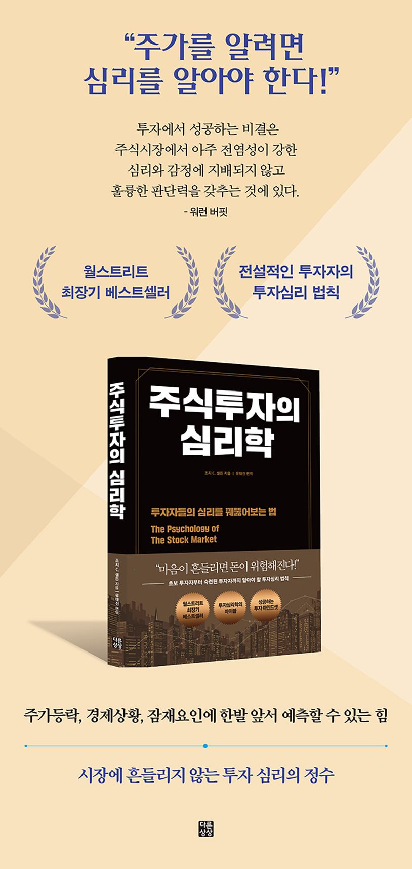 ‘어떻게 투자할 것인가’ 그 해답은 주식시장 속 ‘심리’를 아는 것에 있다. 이 책은 주식시장의 가격 변동이 투자와 거래의 주체인 투자자들의 심리에 크게 좌우된다는 사실을 바탕으로, 주식시장에서 막강한 영향력을 끼치는 심리에 관한 예리한 통찰을 제시한다. 수시로 변하는 사람들의 심리적인 태도가 주가에 어떤 영향을 미치는지, 시장의 어떤 특징적인 부분이 심리적인 요인에 의해 영향을 받는지, 상승장과 하락장에서 어떤 태도를 취해야 하는지, 주식시장의 움직임을 읽어낼 수 있는 능력을 길러준다. 이를 통해 성공하는 투자자의 심리적 특성을 배우고 시장에 흔들리지 않는 태도를 갖출 수 있을 것이다.