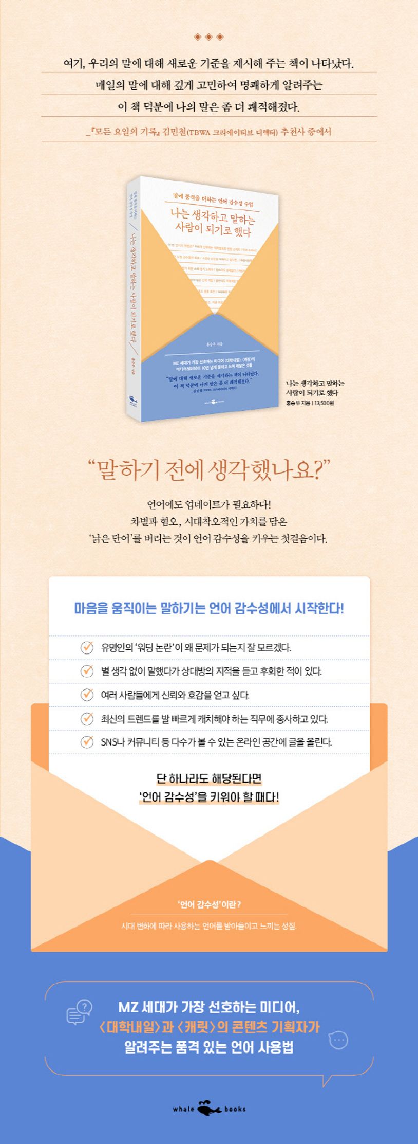트렌드의 최전선에서 연마한 언어 감수성의 정수를 담은 『나는 생각하고 말하는 사람이 되기로 했다』는 미디어에서, SNS에서, 일상 대화에서 가장 많이 사용하는 표현 중 말하는 이의 품격과 호감을 떨어뜨리는 낡은 단어들을 선별해 무엇이 잘못되었으며 어떻게 말해야 하는지 친절하게 설명한다. 스스로의 평판을 지키고, 타인에게 상처 주지 않고, 우리 사회와 발맞추어 가기 위한 올바른 말하기를 고민하는 이들에게 이 책이 훌륭한 언어 감수성 입문서가 되어줄 것이다.