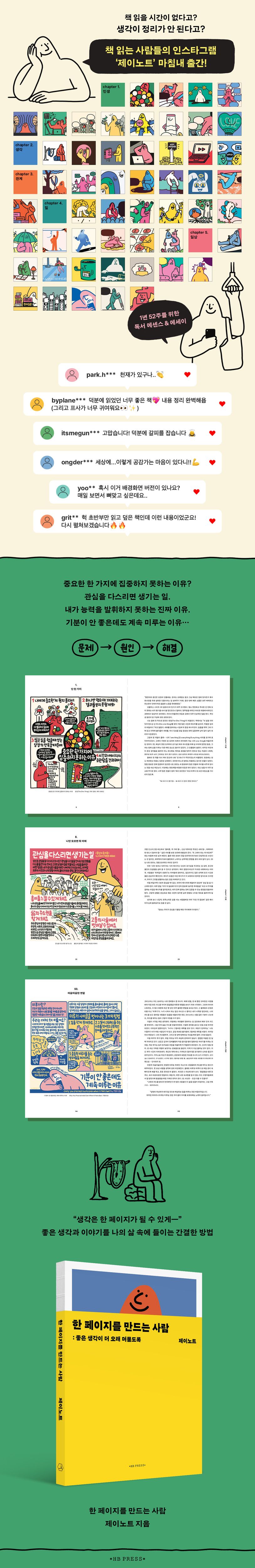 제이노트(j.note)는 책 읽는 사람들의 인스타그램으로 서서히 입소문을 타기 시작해 팔로워 4.5만을 넘었다. 저자에게 도움이 된 책과 강연의 내용을 단 하나의 이미지로 간결하게 표현한 것이 전부였다. 책 한 권을 다 읽기는 어렵고 부담스럽기에, 한 장의 이미지란 단순함에 끌린 걸까? 하지만 제이노트의 이미지 하나를 읽는 데는 쇼츠나 릴스를 볼 때와는 다른 집중력을 요한다. 컷만화처럼 면을 분할해 논리를 전개할 때도 있고, 포스터처럼 한 면을 자유롭게 그림과 글로 콜라주를 펼치기도 한다. 그런 면에서 유행하는 숏폼 콘텐츠와도 다르다. 그래서 인스타도 유튜브도 보지 않는 편집자의 눈에 띄었고, 책 출간에 이르게 되었을 것이다.