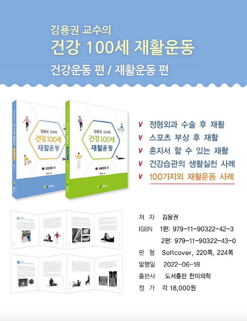 이 저서는 2018년부터 약 3년 동안 저자가 기고했던 여러 언론사의 건강칼럼을 모아서, 독자들이 이해하기 쉽도록 X선 및 MRI 검사 사진 그리고 재활운동 시 동작을 자세하게 추가하였다. 총 8개의 세부주제로 구분하였으며, 100회의 분량을 다루고 있기 때문에 독자들의 건강관리에 큰 도움이 될 것으로 확신한다. 이 책은 집에 꼭 있어야 하는 가정상비약과 같은 통증관리용 건강서적이며, 재활운동 및 스포츠의학을 전공하는 학생들에게도 좋은 교본이 될 것으로 생각한다. 특히 병·의원이나 보건소, 휘트니스센터 등에서 환자의 재활운동을 담당하는 선생님들에게는 필독서가 되길 기대한다. 독자 여러분들이 100세까지 주변의 도움없이 건강하게 생활하기를 간절히 바라는 마음으로 이 책을 집필하였다.