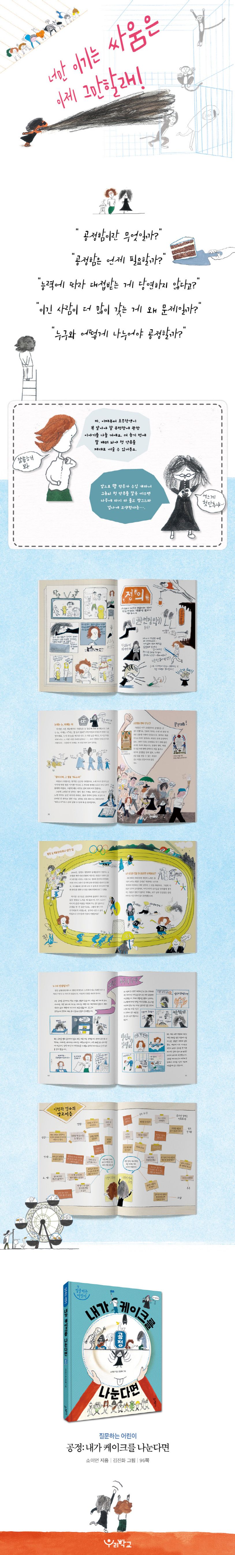 『공정: 내가 케이크를 나눈다면』은 이 질문들에 대한 답을 함께 고민하며, 공정함에 이르는 길을 차근차근 찾아 나가는 책입니다. 물론 쉽지만은 않을 거예요. 케이크도 그 종류가 딸기 케이크부터 고구마 케이크까지 셀 수 없을 만큼 다양하듯이 우리가 일상 속에서 공정함의 문제를 판단해야 하는 상황은 제각기 다르고 매우 복잡할 테니까요. 하지만 지금부터 공정함이 무엇인지 제대로 이해하고 그 기준을 바로 세워 둔다면, 그것이 바로 공정한 세상의 첫 단추를 끼우는 일이 될 거예요. 그럼 분명 앞으로 우리에게 주어지는 어떤 케이크든, 좀 더 공평하고 올바르게 그리고 행복하게 나눠 먹을 수 있겠죠.
