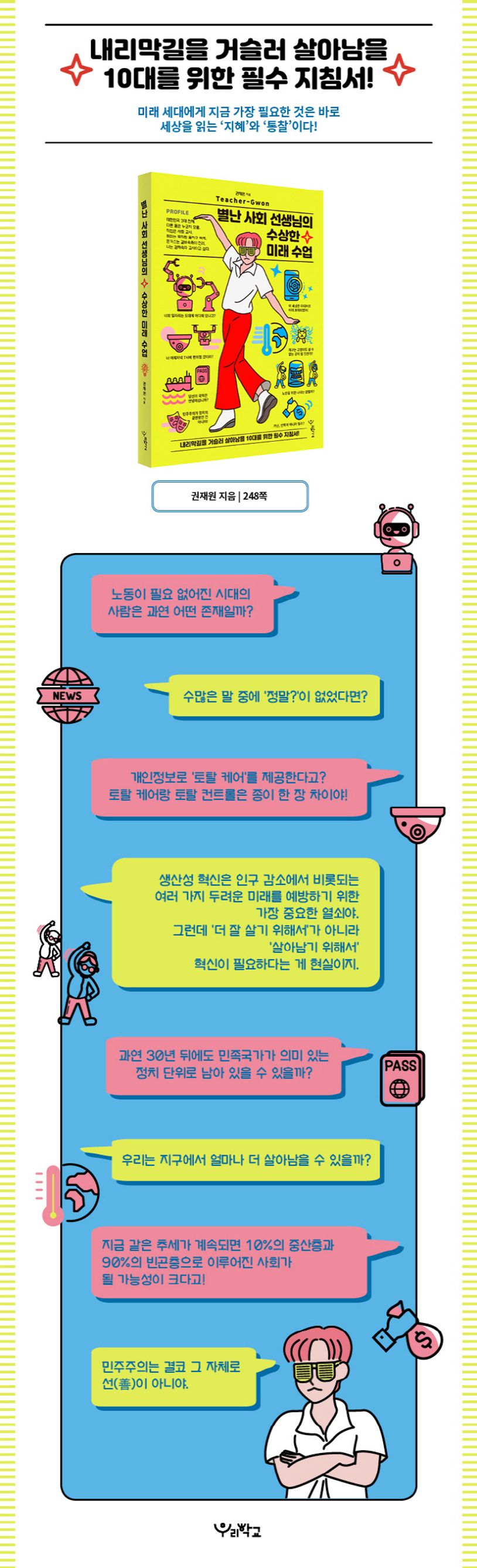저자는 미래 사회의 핵심적인 문제에 깃든 빛과 그림자를 두루 살펴본 뒤, 이런 어려움에 대비하기 위한 팁들을 함께 제시하고 있다. 이 ‘별난’ 사회 선생님은 때로는 묵직한 돌직구 팩트로, 때로는 통찰력이 빛나는 분석으로, 또 때로는 너무 겁내거나 미리 낙심하지 말자는 다독임으로 십 대 독자들을 다양한 사고 실험의 세계로 이끈다. 미래 세계의 여러 측면에 대해 생각해 본 청소년과 그렇지 않은 청소년이 어른이 되어 만들어 갈 세상의 모습은 분명 다를 것이다.