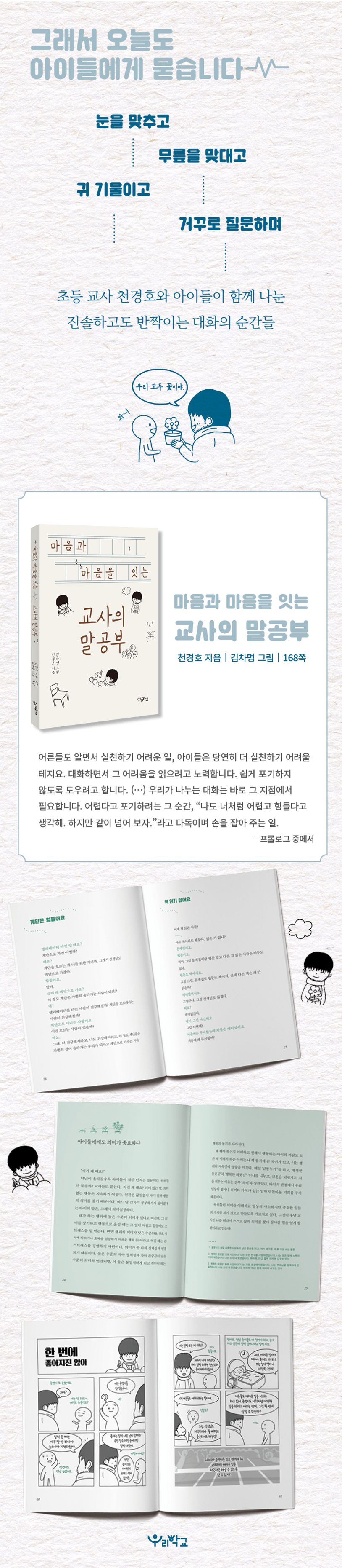 “왜 학교에 다녀야 해요?” “책을 꼭 읽어야 하나요?” “쟤랑 놀기 싫은데요.” “지각 좀 하면 큰일 나요?” 교실 속 아이들 개개인이 지닌 특성과 처한 환경, 문제 상황 등은 저마다 천차만별이다. 그만큼 단순한 질문부터 예상치 못한 말까지 의중과 범위를 가늠할 수 없는 ‘말’들이 교사와 아이들 사이를 끊임없이 오간다. 교사라고 해서 아이들이 품는 질문에 항상 명쾌하게 해답을 주거나 모든 아이의 마음속을 파악하고 있을 리 없다. 그렇기에 교사는 종종 아이들과의 대화에서 길을 잃고 만다. 저경력 시절의 천경호 교사도 그중 한 명이었다.