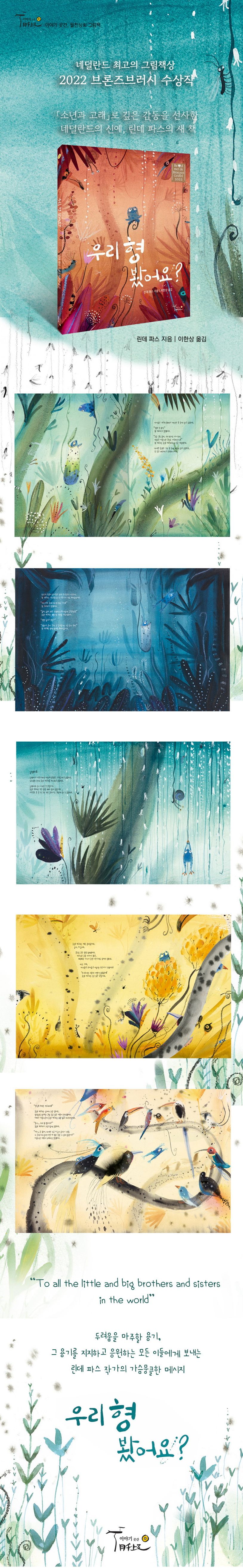전작 〈소년과 고래〉에서 소년과 고래의 우정을 소재로 ‘집은 사랑하는 이가 기다리는 곳’이라는 뭉클한 메시지를 이야기했던 린데파스는, 새 그림책 〈우리 형 봤어요?〉에서도 함께라는 것, 그리고 사랑한다는 것에 대한 이야기를 이어가고 있습니다.