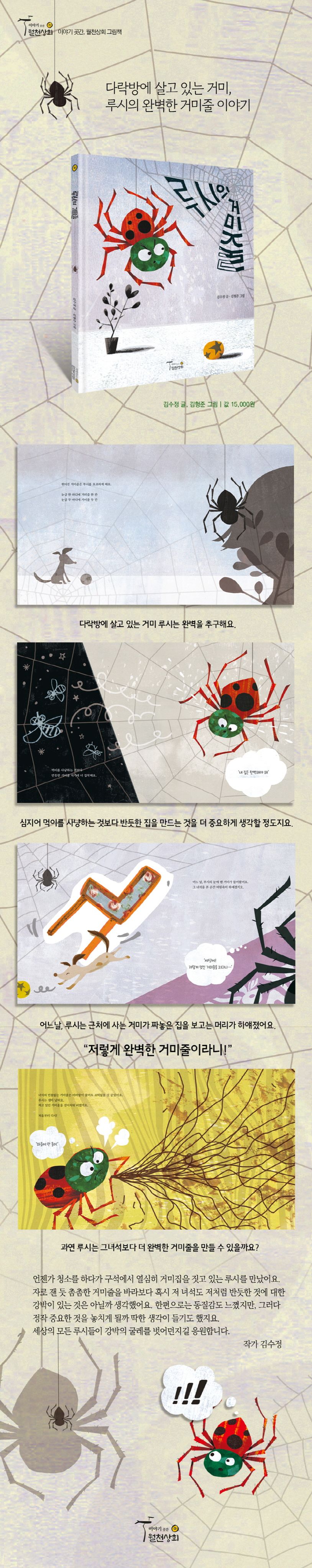 김수정 작가가 글을 쓰고, 김형준 작가가 그림을 그린 〈루시의 거미줄〉은 반듯한 거미집에 집착하는 거미 루시를 통해 완벽이라는 것, 그리고 그 완벽을 추구하는 강박에 대한 이야기를 하고 있습니다.
