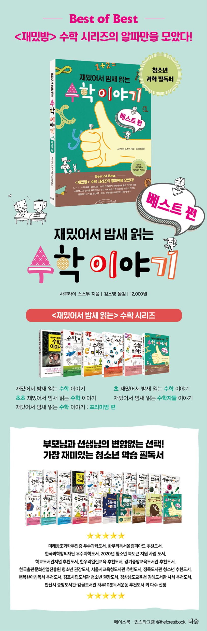 〈재밌어서 밤새 읽는〉 수학 시리즈의 ‘베스트 편’이 출간되었다. 이전에 출간된 4권의 책 《재밌어서 밤새 읽는 수학 이야기》《초 재밌어서 밤새 읽는 수학 이야기》《초초 재밌어서 밤새 읽는 수학 이야기》《재밌어서 밤새 읽는 수학 이야기: 프리미엄 편》 중 누구나 수학을 즐길 수 있는 내용만을 고르고 골라 베스트 편을 구성했다.