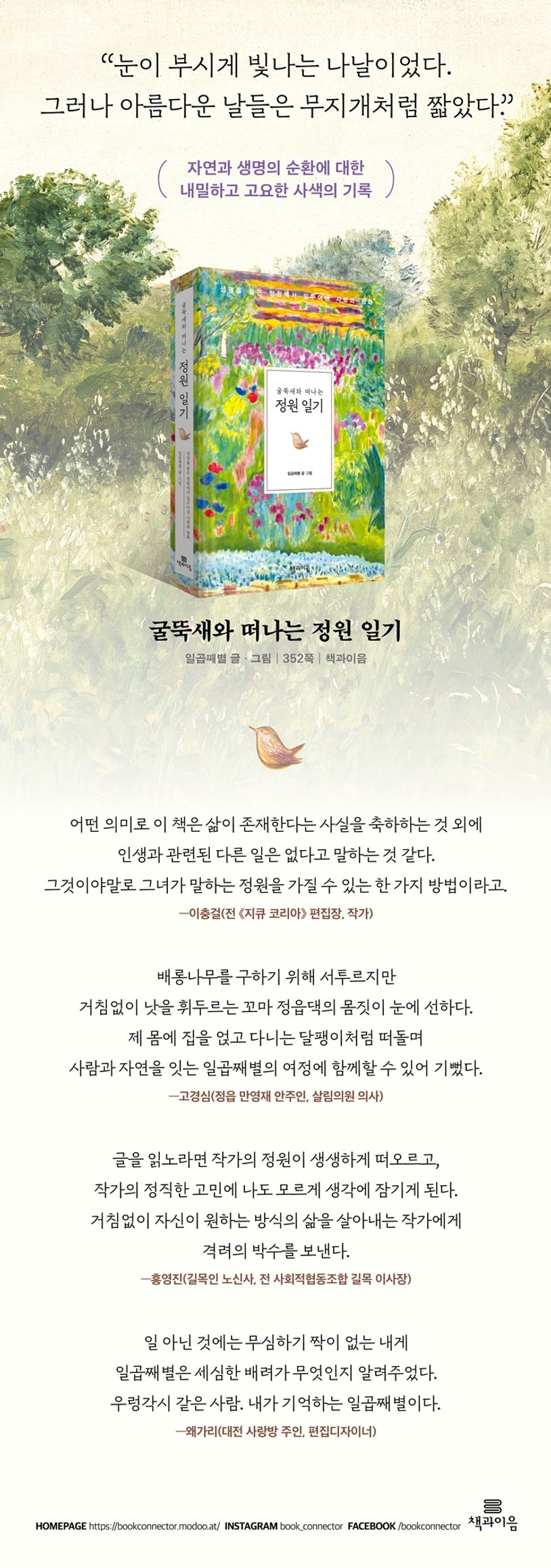 도보로 전국을 순례하며 이 땅의 평화를 위해 기도하고, 거친 투쟁 현장을 찾아다니며 병들고 아프고 소외된 사람들과 기꺼이 연대하는 르포 작가 일곱째별의 첫 에세이집. 미래라고는 보이지 않는 암울한 나날의 고통을 말없이 견디며 어딘가에 있을 자신만의 안식처를 찾아 떠도는 작가의 내밀한 고백이, 배롱나무를 사랑한 굴뚝새의 노랫소리처럼 청아하게 마음을 적신다. 소유하지 않기에 비울 수 있었고, 아낌없이 사랑하기에 떠날 수 있었다. 태어나 만나고 사랑하고 이별하고 소멸하는 자연의 법칙이 지배하는 작은 정원에서 배운 소박한 삶의 지혜가 맑고 푸르른 문장으로 책 곳곳에 새겨져 있다.