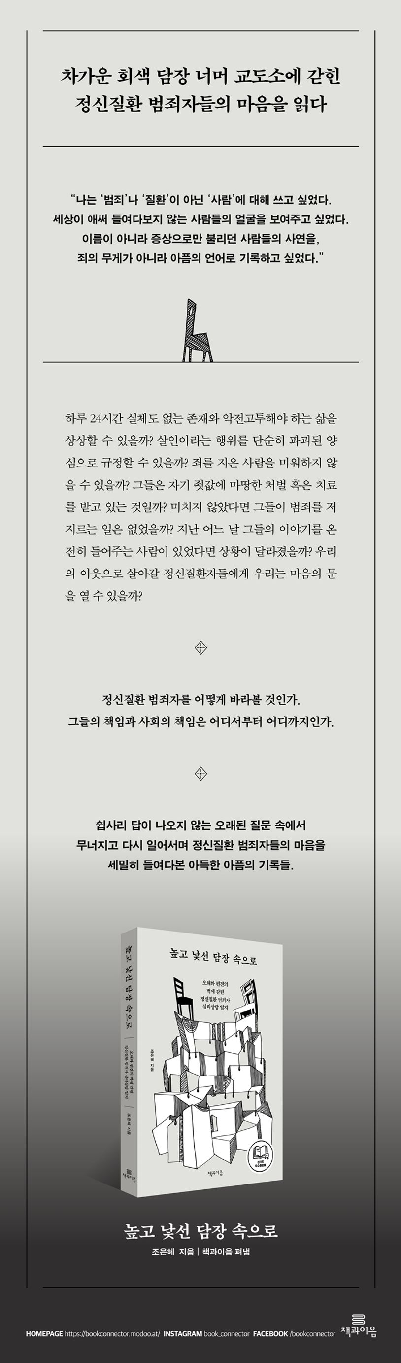 교도소에서 정신질환 범죄자들을 만나며 그들의 마음을 가까이에서 들여다본 작가의 직업적 번민과 인간적 고뇌가 담긴 심리상담 기록. 정신질환 범죄자들을 대상으로 한 교도소의 실제 상담 장면을 생생하게 묘사함으로써 질환과 범죄, 피해의 단순한 연관성을 넘어, 그 이면에 숨은 복잡한 사회적 이슈를 함께 고민해볼 수 있도록 구성했다. 이 책은 정신질환 범죄자에 대한 우리 사회의 일반적 편견에 대해 옳다거나 그르다는 식의 답을 섣불리 내놓지 않는다. 다만 작가가 현장에서 경험한 사례를 통해, 이들이 어떤 생각을 하고 사는지, 어떤 과정에서 범죄에 이르게 되는지를 담담하고도 고통스럽게 보여준다. 정신질환 범죄자들이 그들의 온 삶으로 들려주는 이야기에 귀 기울임으로써 우리는 그들의 마음을 좀 더 잘 이해할 수 있을 것이며, 이를 통해 범죄 예방과 사회 안전으로 나아가는 해법까지도 모색할 수 있다고 믿는다. ※ 2025 경기도 우수출판물 제작지원 사업 선정작.